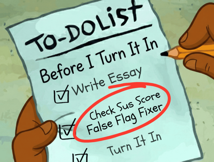 1 in 3 essays get falsely flagged by Turnitin and other AI detectors. Not for cheating. For writing too well. Before you turn it in, add one more thing to your pre-submission checklist: Check Sus Score. πŸ‘€ It takes 10 seconds and could save your GPA.